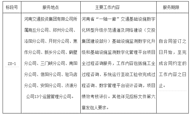2.2本次招标项目为河南省“一轴一廊”交通基础设施数字化转型升级示范通道及网络建设(交投集团建设部分)基础设施监测数字化升级和基础设施监测数字化管理平台项目全过程咨询服务招标。共分1个标段。具体标段划分、主要工作内容及服务期见下表: