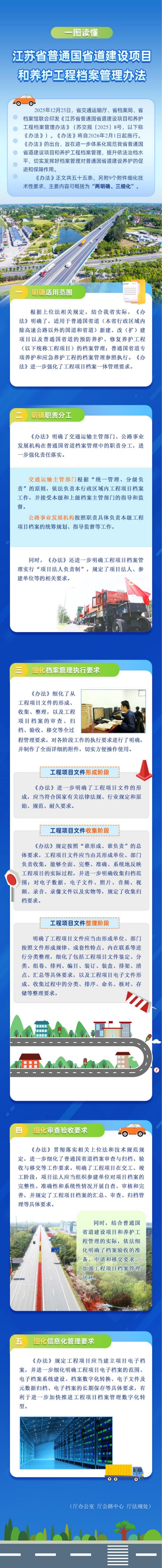 近日,省交通运输厅、省档案局、省档案馆联合印发《江苏省普通国省道建设项目和养护工程档案管理办法》(以下称《办法》),将于2026年2月1日起施行。《办法》重点明确四个方面要求,进一步体系化规范我省普通国省道建设项目和养护工程档案管理。