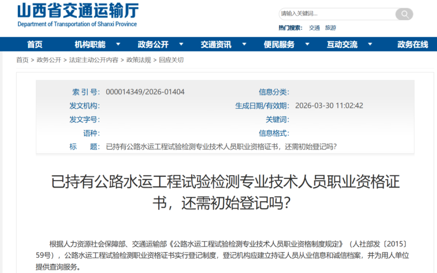 2026年3月30日,山西省交通运输厅发布政策解读,明确公路水运工程试验检测专业技术人员职业资格证书实行登记管理制度:根据人力资源社会保障部、交通运输部《公路水运工程试验检测专业技术人员职业资格制度规定》要求,持证人员需登录“公路水运工程试验检测专业技术人员管理平台”办理初始登记,登记机构将同步建立持证人员从业信息和诚信档案,向用人单位提供信息查询服务。