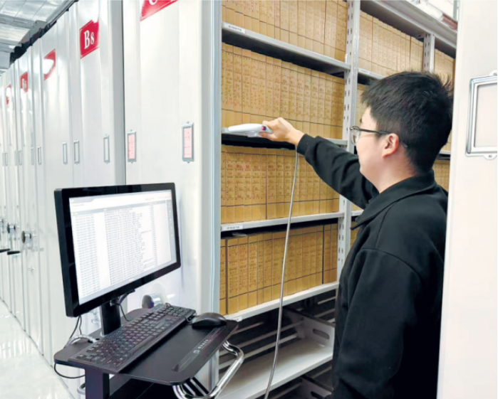 市档案馆严格按照“一档一标签”原则,开展实体档案电子标签注册工作,为每件实体档案配备唯一电子身份标识。截至目前,已累计完成5万余张档案标签和2392张层架标签的注册与张贴工作,实现了档案管理全流程电子化、智能化。过去,查找档案需在密集柜中逐一翻找,耗时费力。如今,通过电子标签定位,系统可“秒级响应”精准锁定档案位置,大幅提升查阅效率。