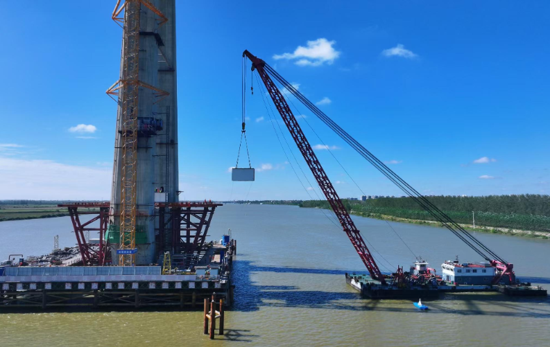 本次吊装的钢梁长8米,重约35.1吨,采用300吨浮吊吊装就位。为确保此次高风险吊装作业万无一失,项目进行了周密部署,模拟了不同水位下吊装工况,组织参建各方进行了桌面推演,拟出关键工序控制清单,并在钢梁正式吊装前进行了现场试吊,实时监测支架变形和主梁吊装姿态,对风速、风向等环境因素进行实时监测,确保梁段安装精度控制在允许范围内。