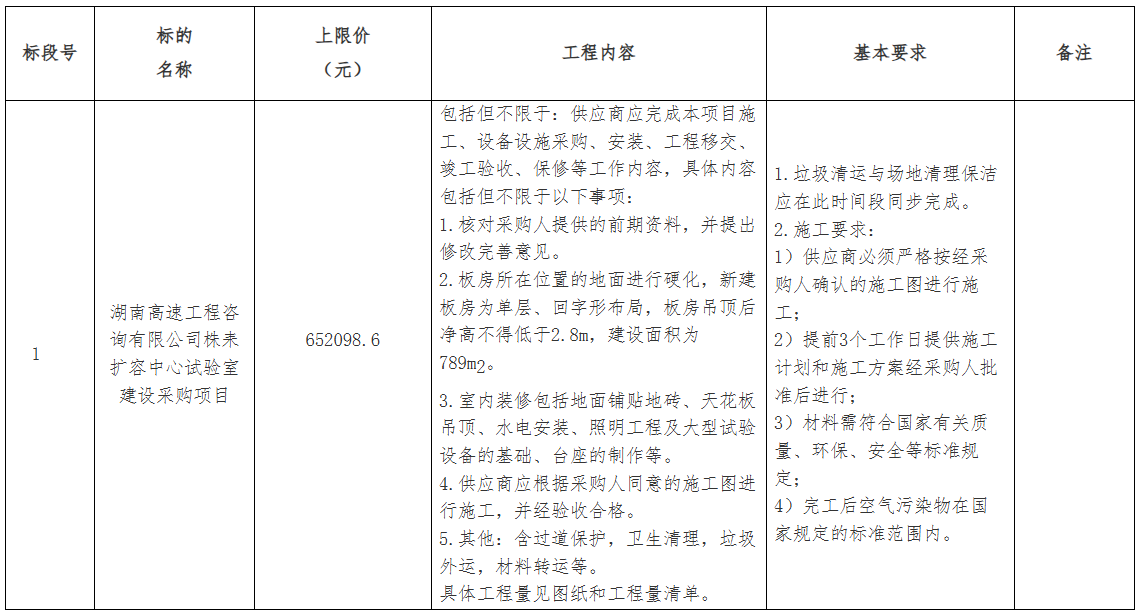 湖南高速工程咨询有限公司株耒扩容中心试验室建设采购项目已具备采购条件,本采购项目由湖南省高速公路集团有限公司牵头组织,采购需求人湖南高速工程咨询有限公司共同参与,现对该项目进行公开采购。