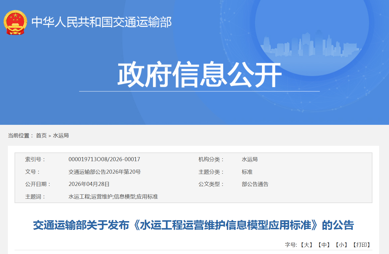 交通运输部关于发布《水运工程运营维护信息模型应用标准》将于2026年6月1日起施行