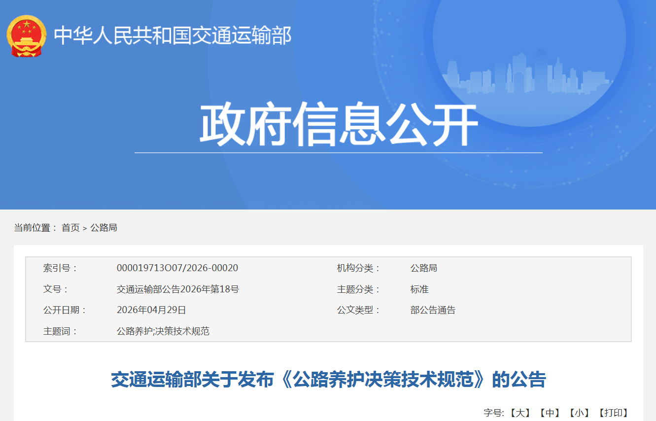 交通运输部关于发布《公路养护决策技术规范》将于2026年6月1日起施行