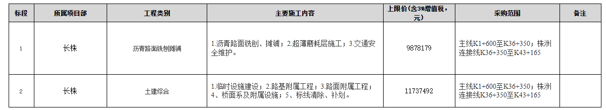 2.2采购范围:长株高速沥青路面铣刨摊铺劳务(包括但不限于路面铣刨摊铺、超薄磨耗层处治、交通安全维护等)、土建综合劳务(包括但不限于临时建设、路基路面附属工程、桥面系及附属设施、标线清除、补划等)。