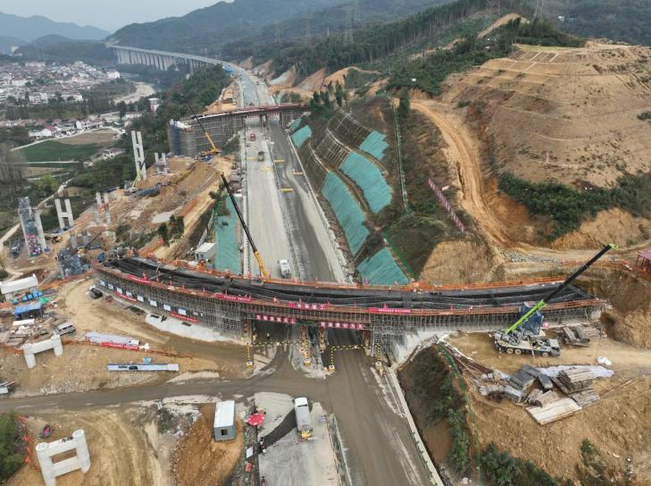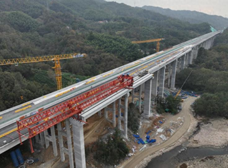 初冬的大别山层林尽染,安徽省六安市金寨县天堂寨支线高速公路建设现场却激战正酣。11月,安徽建工路桥承建的一标一分部实现双重大突破:青山枢纽十里溪拼宽桥完成全线首片梁板毫米级精准架设,首联现浇箱梁同步启动浇筑,标志着工程正式进入桥梁上部结构施工阶段,400余名建设者正昼夜抢抓冬季施工黄金期。