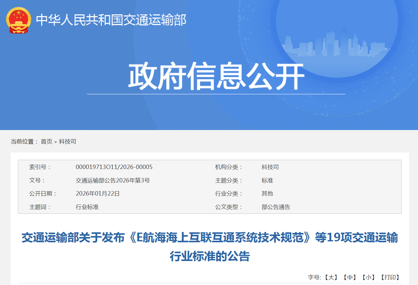 《E航海海上互联互通系统技术规范》等19项交通运输行业标准(2026年第3批,见附件)业经审查通过,现予发布。发布的标准均为推荐性标准,由人民交通出版社股份有限公司出版,并在中华人民共和国交通运输部网站公布。