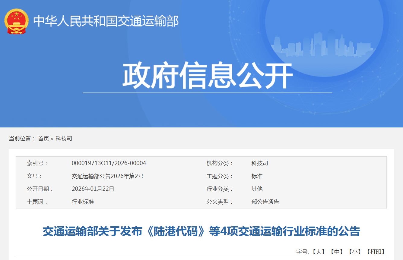 《陆港代码》等4项交通运输行业标准(2026年第2批,见附件)业经审查通过,现予发布。发布的标准均为推荐性标准,由人民交通出版社股份有限公司出版,并在中华人民共和国交通运输部网站公布。
