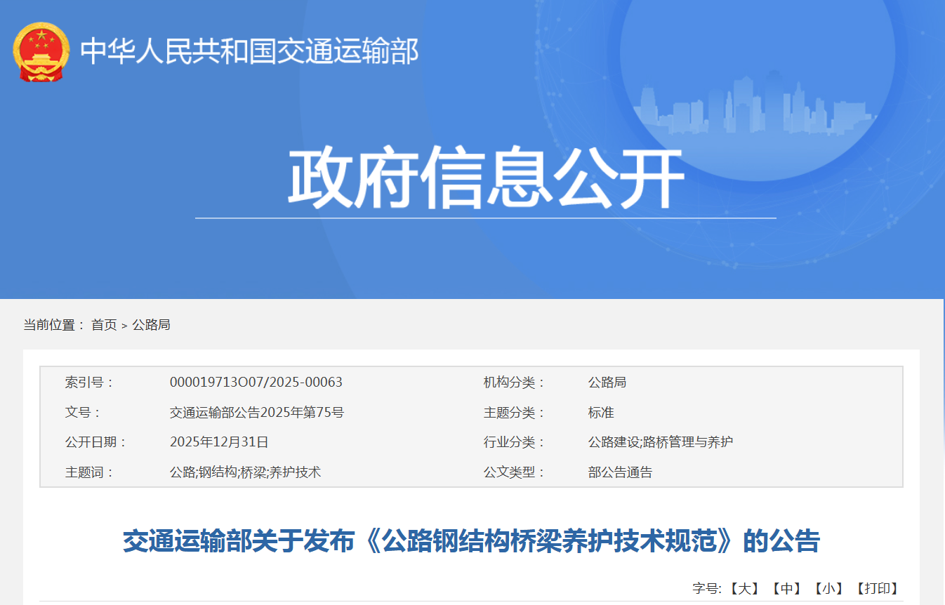 交通运输部关于发布《公路钢结构桥梁养护技术规范》将于2026年4月1日起施行