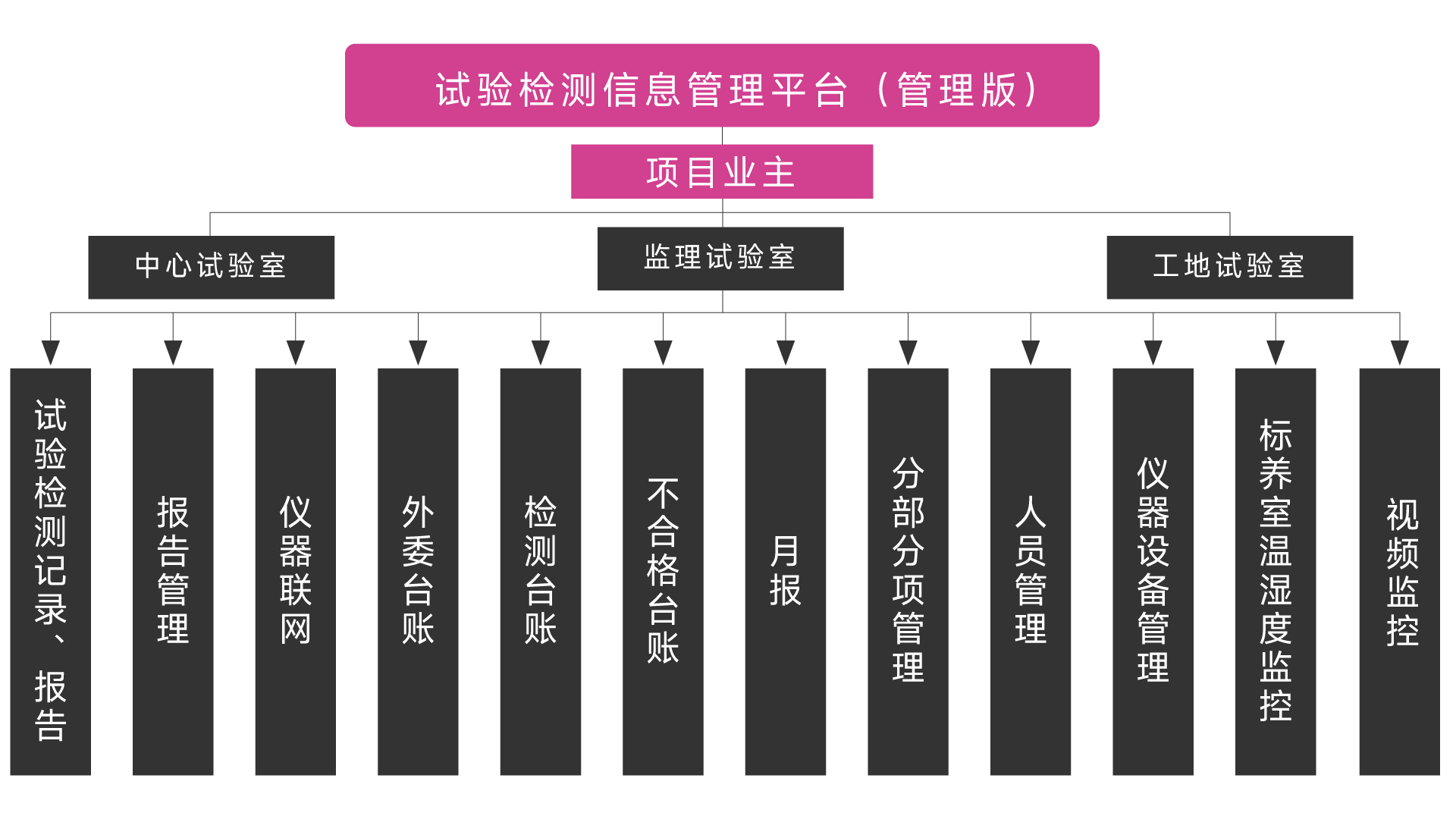 - 管理平台以试验检测数据为核心,可实时查询各标段试验室的仪器联网、试验检测数据、检测台账、不合格台账、月报、检测频率、质量评定、人员管理、设备管理、试验室信息、温湿度监控、视频监控等数据信息,同时具备试验审批功能,可线上提交试验资料报监理、业主审批,实现远程监管和数据共享。